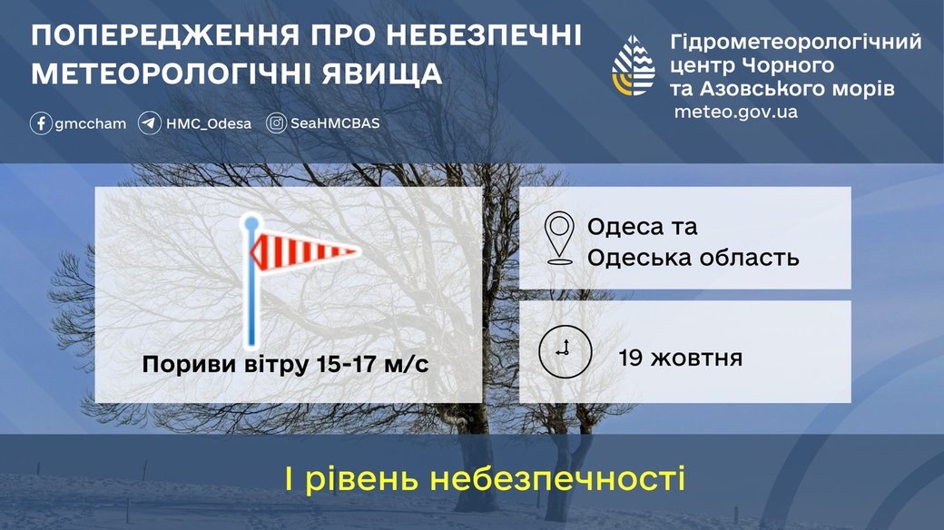 На 19 жовтня в Одесі та Одеській області оголошено штормове попередження — очікується вітряна погода та дощі. Про це повідомили 18 жовтня в Гідрометцентрі Чорного та Азовського морів.